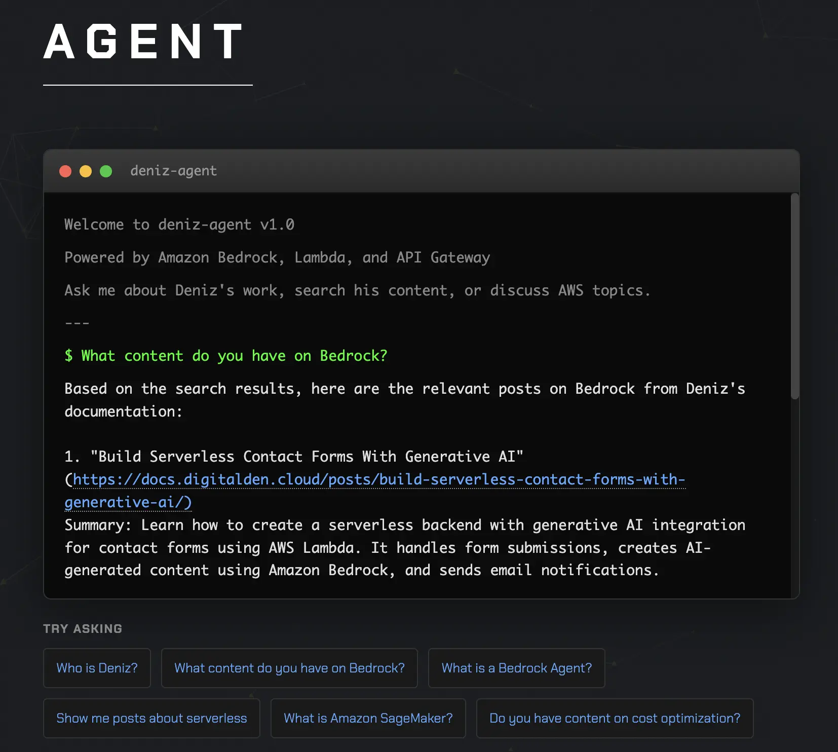 I opened the site on my phone to test it as a real visitor would. Clicked Agent in the navigation. The terminal appeared. Typed “What content do you have on Bedrock?” and hit enter. The loading dots appeared. A few seconds later, the response came back with titles, summaries, and links to my posts. It worked. I tested a few more questions. Asked about serverless. Asked who Deniz is. Asked what a Bedrock Agent is. All worked as expected.