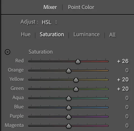 | Saturation | Boosts all colours equally | 0 | Even +1 triggered pink clipping |